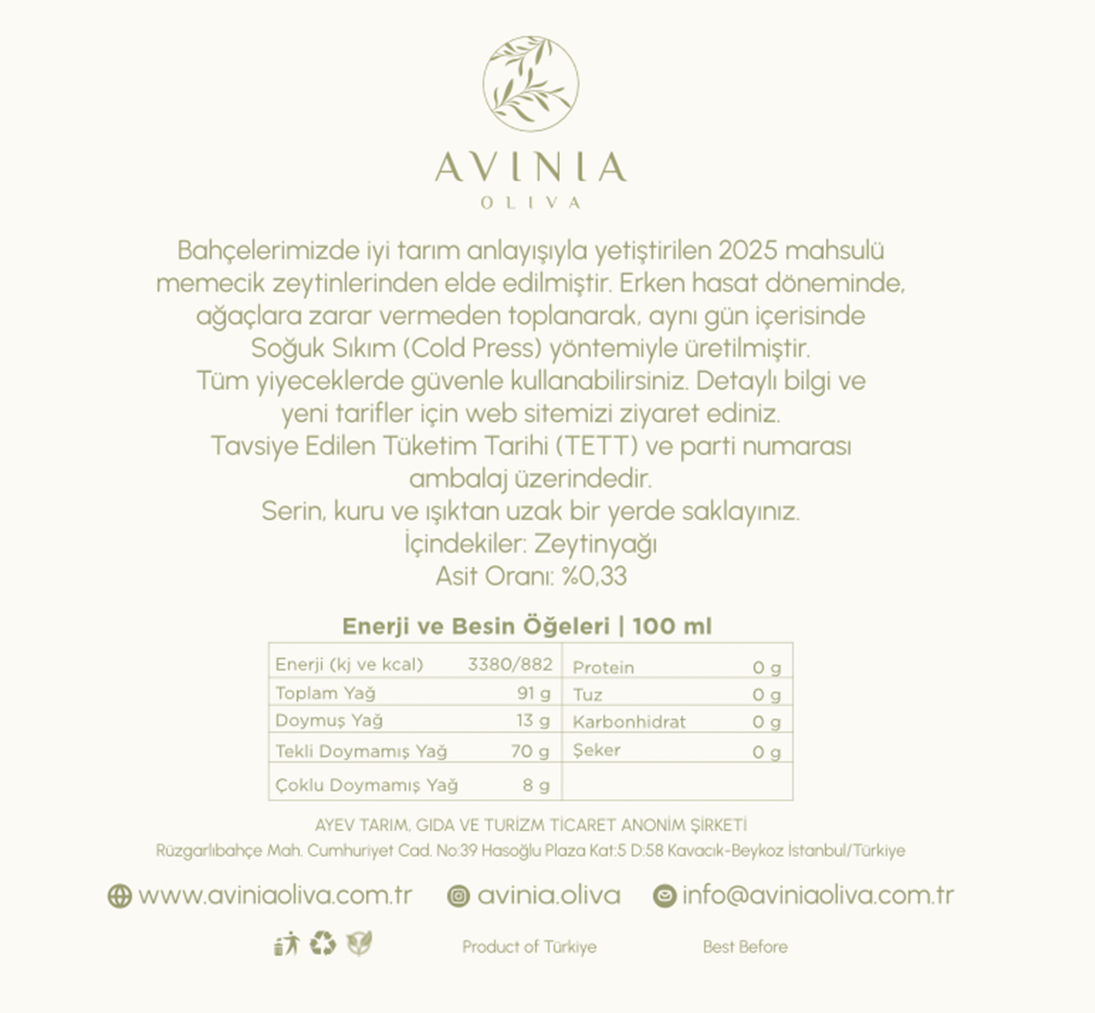 Bahçelerimizde iyi tarım anlayışıyla yetiştirilen 2025 mahsulü memecik zeytinlerinden elde edilmiştir.